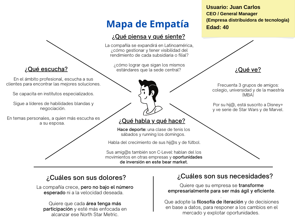 En este punto, existen distintos recursos de investigación del usuario. A continuación, coloco un Mapa de Empatía que elaboré sobre un perfil objetivo de la empresa de servicios de tecnología. La empresa implementa y comercializa la tecnología ERP de Oracle NetSuite.