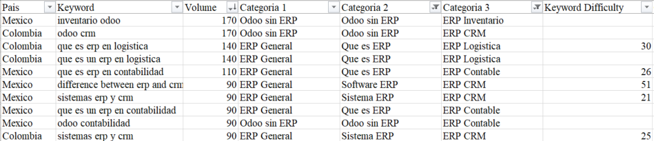 - El segundo nivel de categoría clasificaba cómo estaba construida la palabra clave (si contenía preposiciones; o términos de pregunta como “que es un erp”; o sustantivos previos como “sistema erp” o “software erp”).
