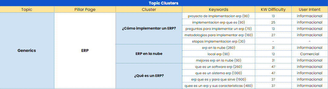 - Para las keywords Generics, se parte de una pillar page enfocada en la keyword “ERP”, pero se plantea pillar pages secundarias, como ERP en la nube, ¿Cómo implementar un ERP?, ¿Qué es un ERP?