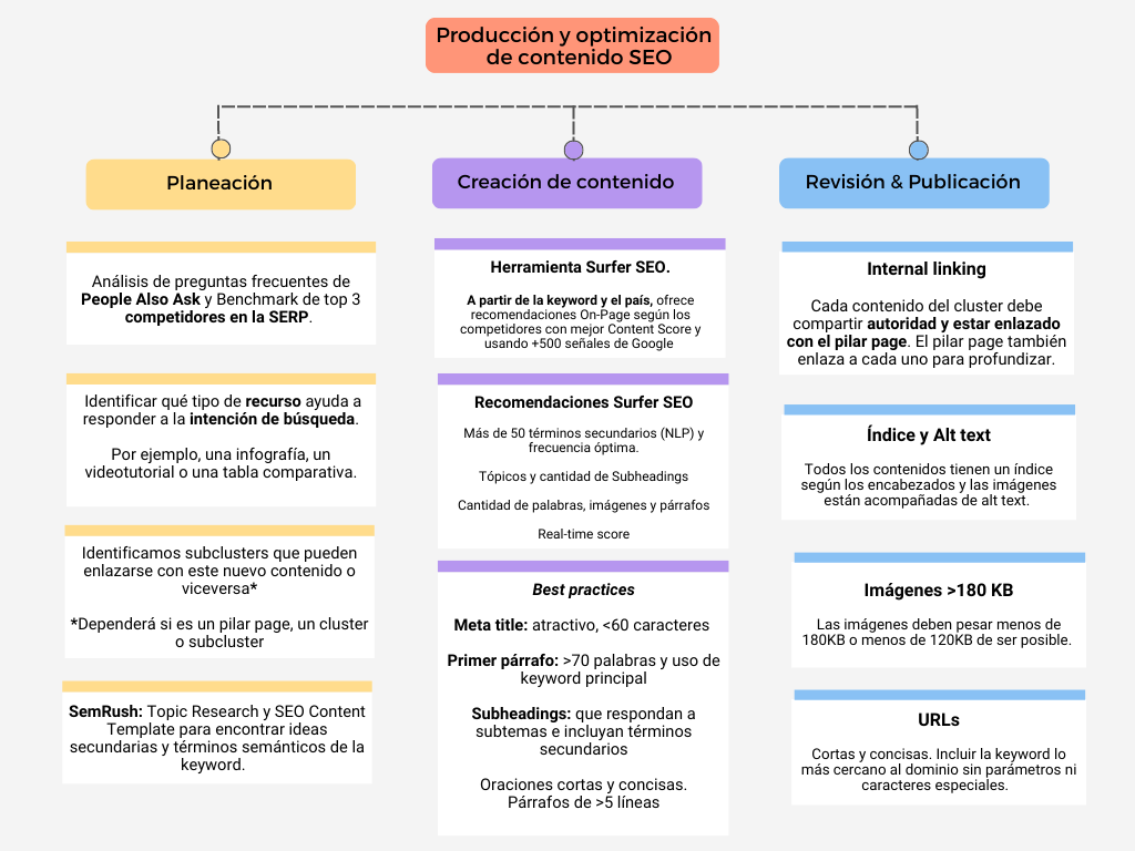 Primero escojo el topic cluster a posicionar y se mapean las keywords principales y secundarias que se usará en este contenido. Defino qué tipo de formato responde mejor a la búsqueda del usuario: ¿texto + videoblog? ¿un videotutorial? ¿una infografía? ¿una nota en formato FAQ?