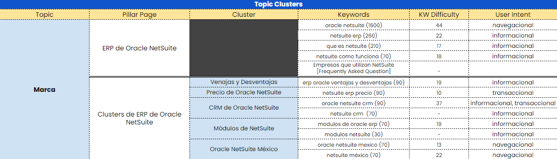 En el Topic Cluster, un ejemplo de ello es “Empresas que utilizan NetSuite” y “Modulos de NetSuite”.