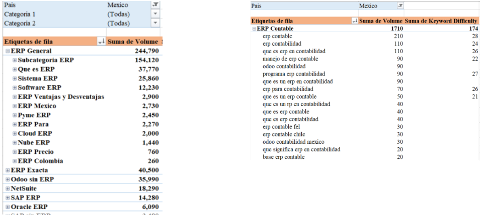 4. Armé una tabla dinámica donde podía desglosar las categorías para ver el volumen de búsquedas, la dificultad y agregué un filtro superior de país para poder hacer un análisis individual. Esta fue la base para armar el Topic Cluster.